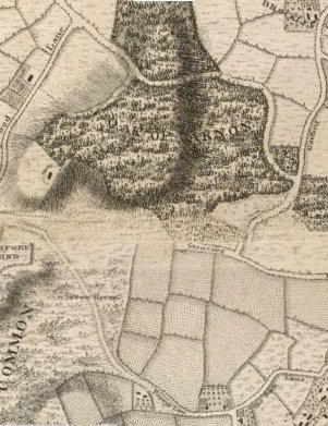 This mid C18 map fragment shows the area Honor Oak (Oak of Arrnon) some 150 years after Queen E's honourable and elderly frolicking.