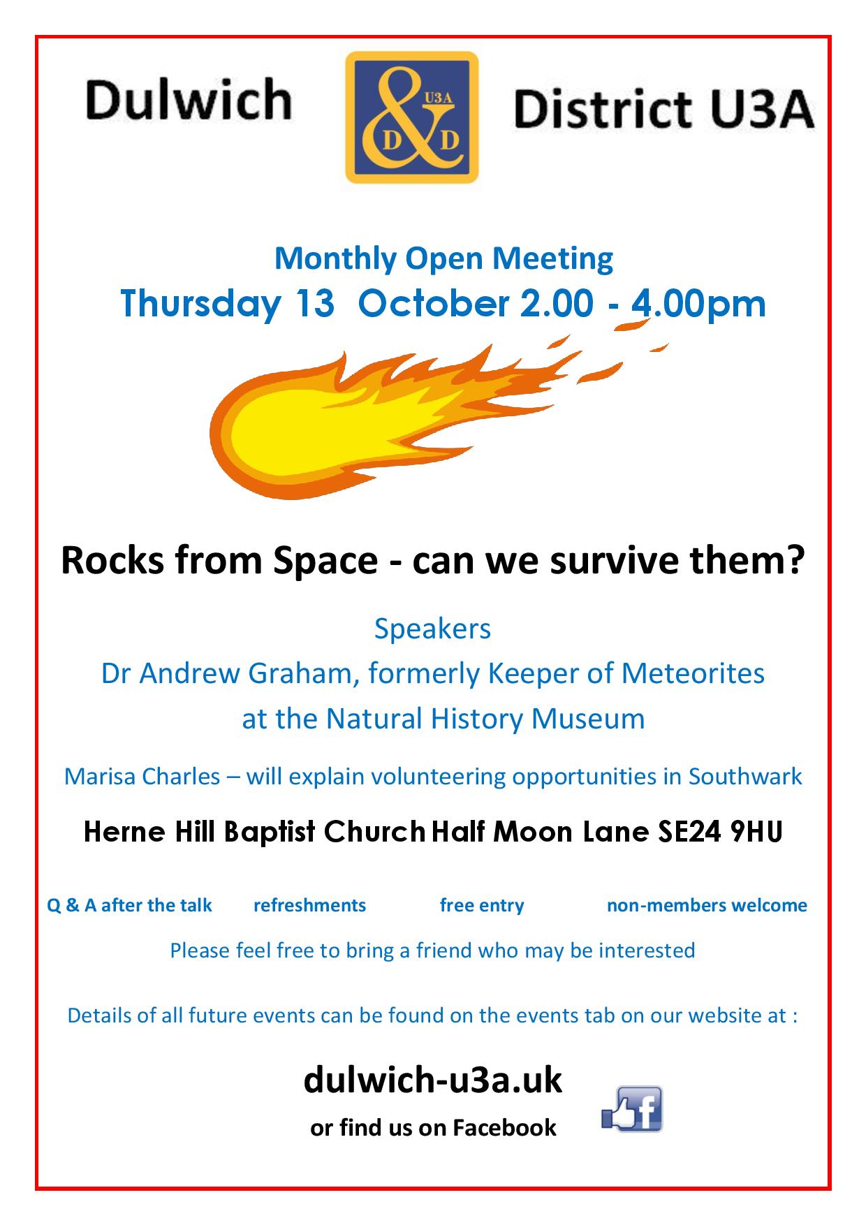 Talk: Rocks from space - can we survive them ? Thurs 13th Oct 2:00 - 4:00pm