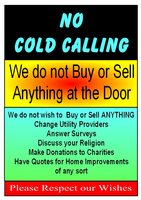 This is the sign I have on my door. Printed on A5 and laminated. Please feel free to use it. It seems to work with most Cold Callers except those who say they haven't seen it who are then directed to Specsavers