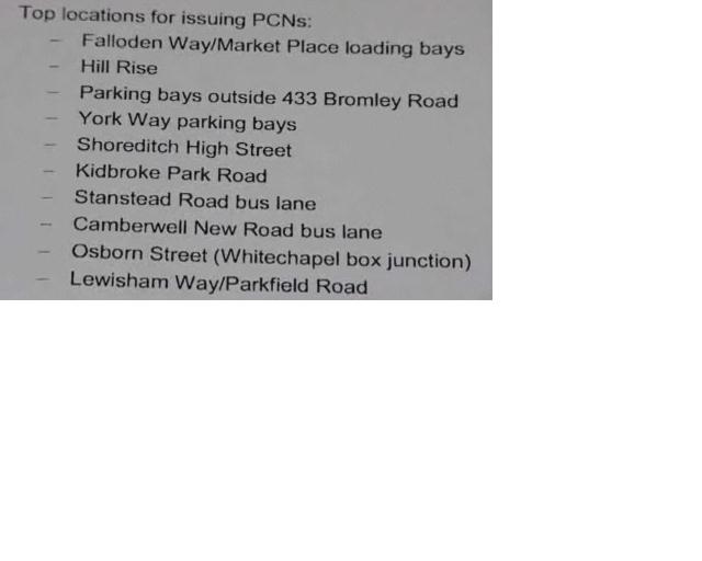 The item shows a list of the top locations for issuing PCNs, Stanstead Road bus lane is number 7.