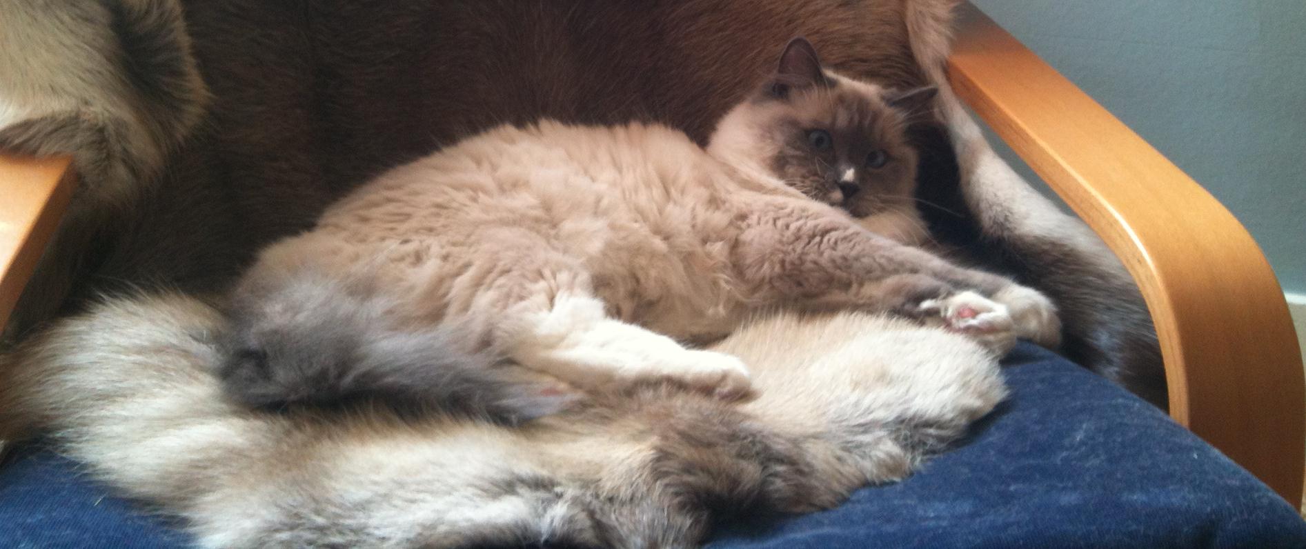 He is a big, grey and white fluffy cat, with white paws and blue eyes. His name is Maui.