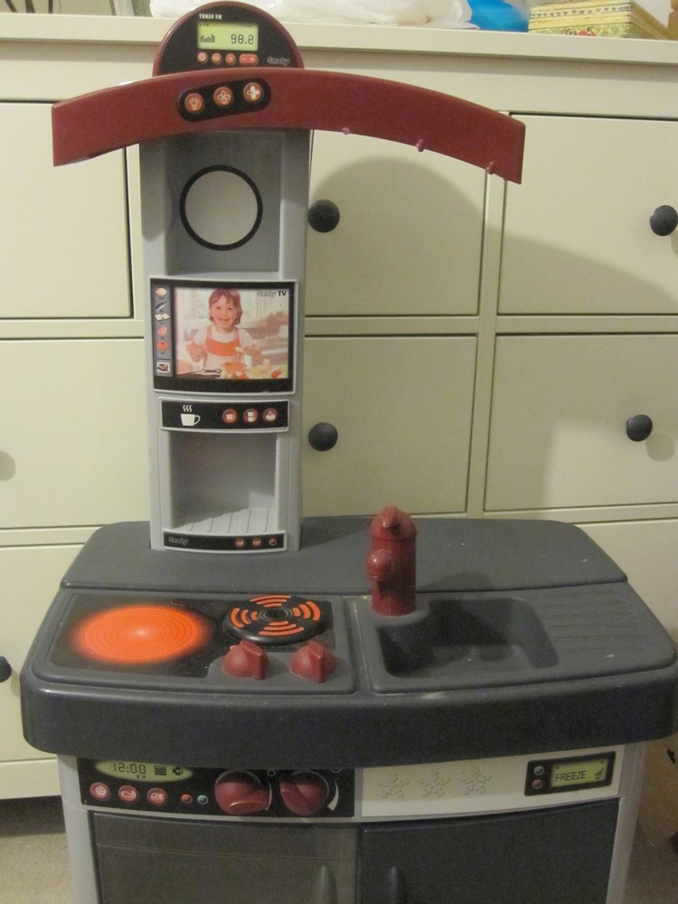 It has a fridge and oven with doors, a sink with a movable tap, a cooking hob that makes a sizzling noise when a pan is placed on it (requires 2 AA batteries), rear storage and shelf storage.