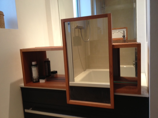Mirror slides along shelf (wall-mounted) for bedroom or bathroom use.