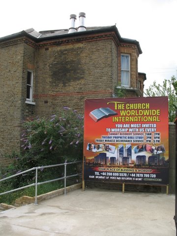 Dreadful signs outside the Church Worldwide, at the new David's Road entrance at the bottom of Manor Mount. This is the old St John's church, which was lovely, and still should be.