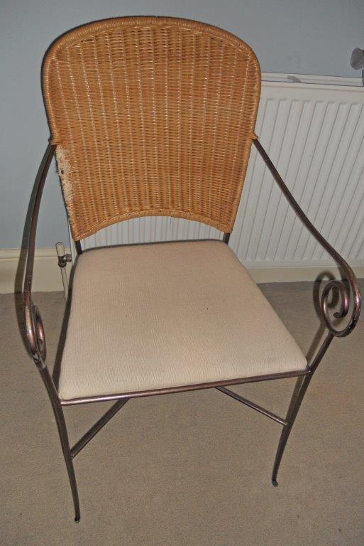 for sale , lovely wrought iron frame chair with cream upholstered seat pad...and wicker back, that does have a scuffed edge on one side,,but I normally put a cushion to hide it!
