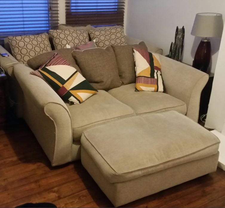 Its a two seater, low back but I'll include 3 cushions. Has barely been sat on as clearly a three seater and two seater is total overkill for a one bed flat...